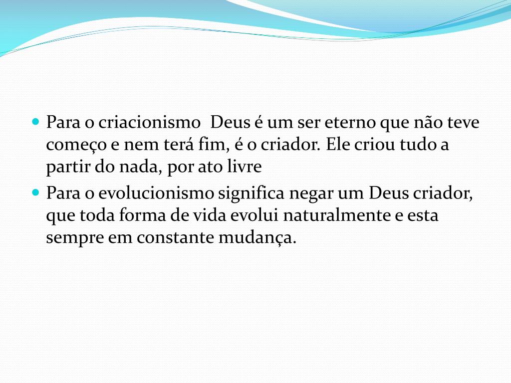 Para o criacionismo Deus é um ser eterno que não teve começo e nem terá fim, é o criador. Ele criou tudo a partir do nada, por ato livre • Para o evolucionismo significa negar um Deus criador, que toda forma de vida evolui naturalmente e esta sempre em constante mudança.