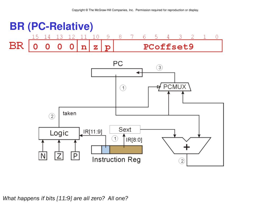 Branch Instruction Branch specifies one or more condition codes. If the specified bit is set, the branch is taken. • PC-relative addressing:target address is made by adding signed offset (IR[8:0])to current PC. • Note: PC has already been incremented by FETCH stage. • Note: Target must be within 256 words of BR instruction. If the branch is not taken,the next sequential instruction is executed.