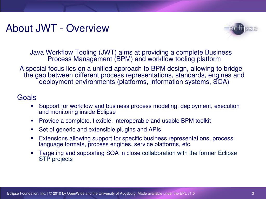 About JWT - Overview Java Workflow Tooling (JWT) aims at providing a complete Business Process Management (BPM) and workflow tooling platform A special focus lies on a unified approach to BPM design, allowing to bridge the gap between different process representations, standards, engines and deployment environments (platforms, information systems, SOA) Goals Support for workflow and business process modeling, deployment, execution and monitoring inside Eclipse Provide a complete, flexible, interoperable and usable BPM toolkit Set of generic and extensible plugins and APIs Extensions allowing support for specific business representations, process language formats, process engines, service platforms, etc. Targeting and supporting SOA in close collaboration with the former Eclipse STP projects