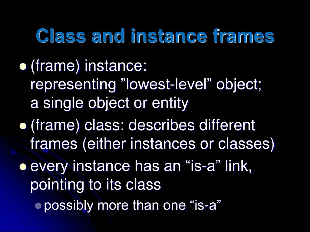 Class and instance frames • (frame) instance: representing ”lowest-level” object; a single object or entity • (frame) class: describes different frames (either instances or classes) • every instance has an “is-a” link, pointing to its class • possibly more than one “is-a”