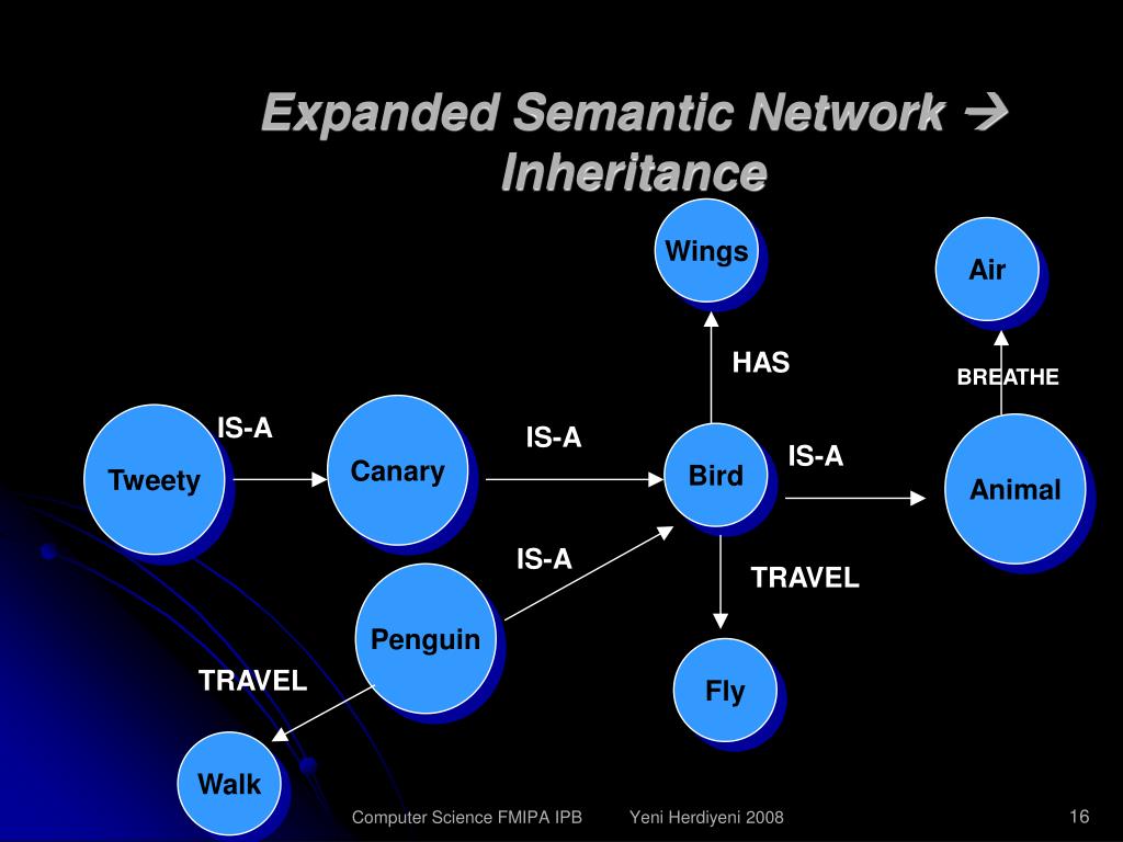 Semantic Network Techniques (Cont.) Wings HAS Canary IS-A Bird TRAVEL Fly Computer Science FMIPA IPB Yeni Herdiyeni 2008 15
