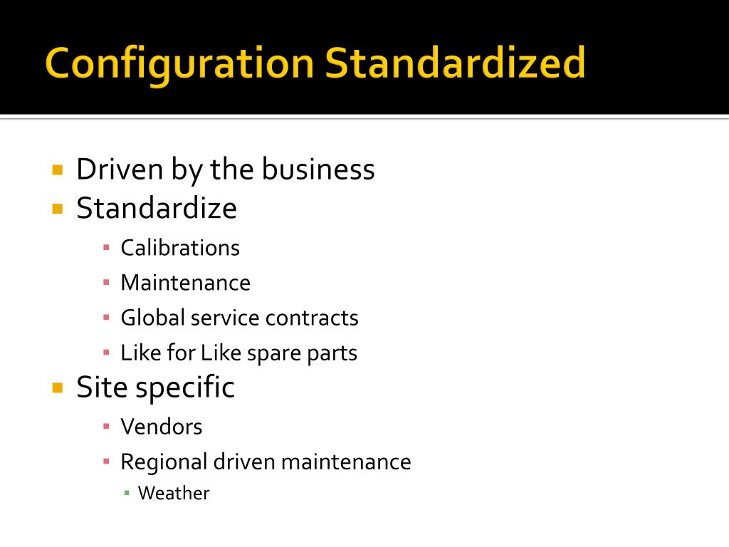 Configuration Standardized • Driven by the business • Standardize • Calibrations • Maintenance • Global service contracts • Like for Like spare parts • Site specific • Vendors • Regional driven maintenance • Weather