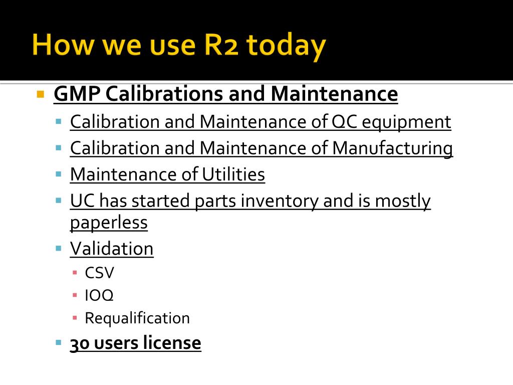 How we use R2 today • GMP Calibrations and Maintenance • Calibration and Maintenance of QC equipment • Calibration and Maintenance of Manufacturing • Maintenance of Utilities • UC has started parts inventory and is mostly paperless • Validation • CSV • IOQ • Requalification • 30 users license