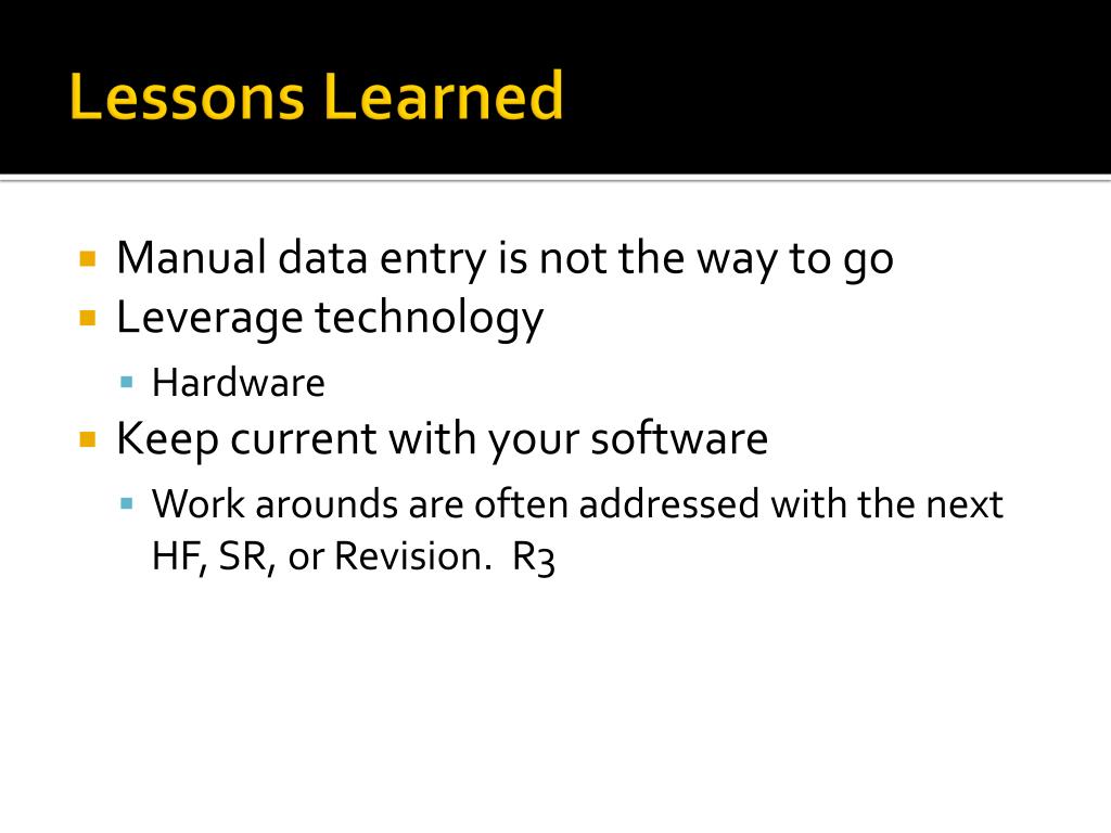 Lessons Learned • Manual data entry is not the way to go • Leverage technology • Hardware • Keep current with your software • Work arounds are often addressed with the next HF, SR, or Revision. R3