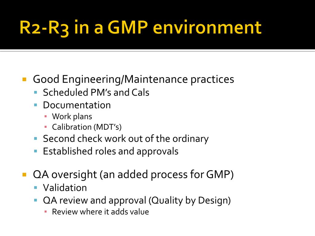 R2-R3 in a GMP environment • Good Engineering/Maintenance practices • Scheduled PM’s and Cals • Documentation • Work plans • Calibration (MDT’s) • Second check work out of the ordinary • Established roles and approvals • QA oversight (an added process for GMP) • Validation • QA review and approval (Quality by Design) • Review where it adds value