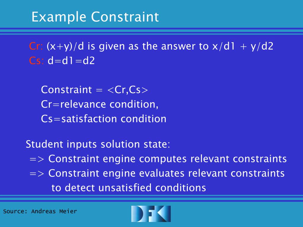 Example Constraint Cr: (x+y)/d is given as the answer to x/d1 + y/d2 Cs: d=d1=d2 Constraint = <Cr,Cs> Cr=relevance condition, Cs=satisfaction condition Student inputs solution state: => Constraint engine computes relevant constraints => Constraint engine evaluates relevant constraints to detect unsatisfied conditions