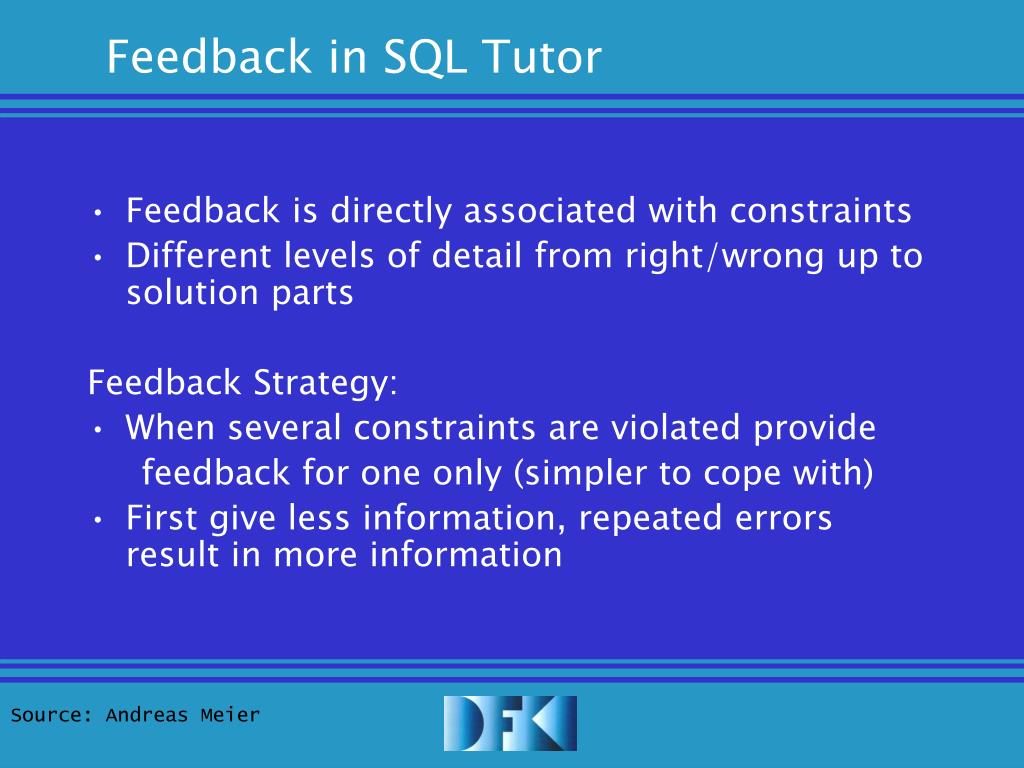 Feedback in SQL Tutor • Feedback is directly associated with constraints • Different levels of detail from right/wrong up to solution parts Feedback Strategy: • When several constraints are violated provide feedback for one only (simpler to cope with) • First give less information, repeated errors result in more information