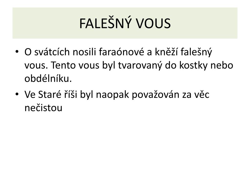 FALEŠNÝ VOUS • O svátcích nosili faraónové a kněží falešný vous. Tento vous byl tvarovaný do kostky nebo obdélníku. • Ve Staré říši byl naopak považován za věc nečistou