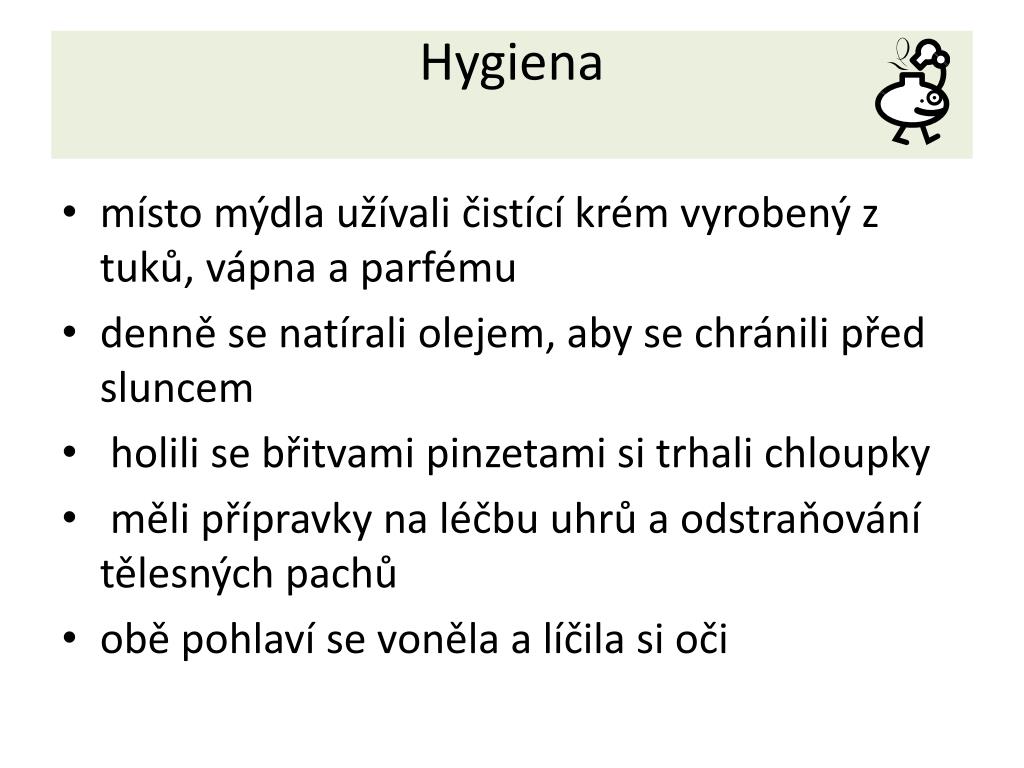 Hygiena • místo mýdla užívali čistící krém vyrobený z tuků, vápna a parfému • denně se natírali olejem, aby se chránili před sluncem • holili se břitvami pinzetami si trhali chloupky • měli přípravky na léčbu uhrů a odstraňování tělesných pachů • obě pohlaví se voněla a líčila si oči