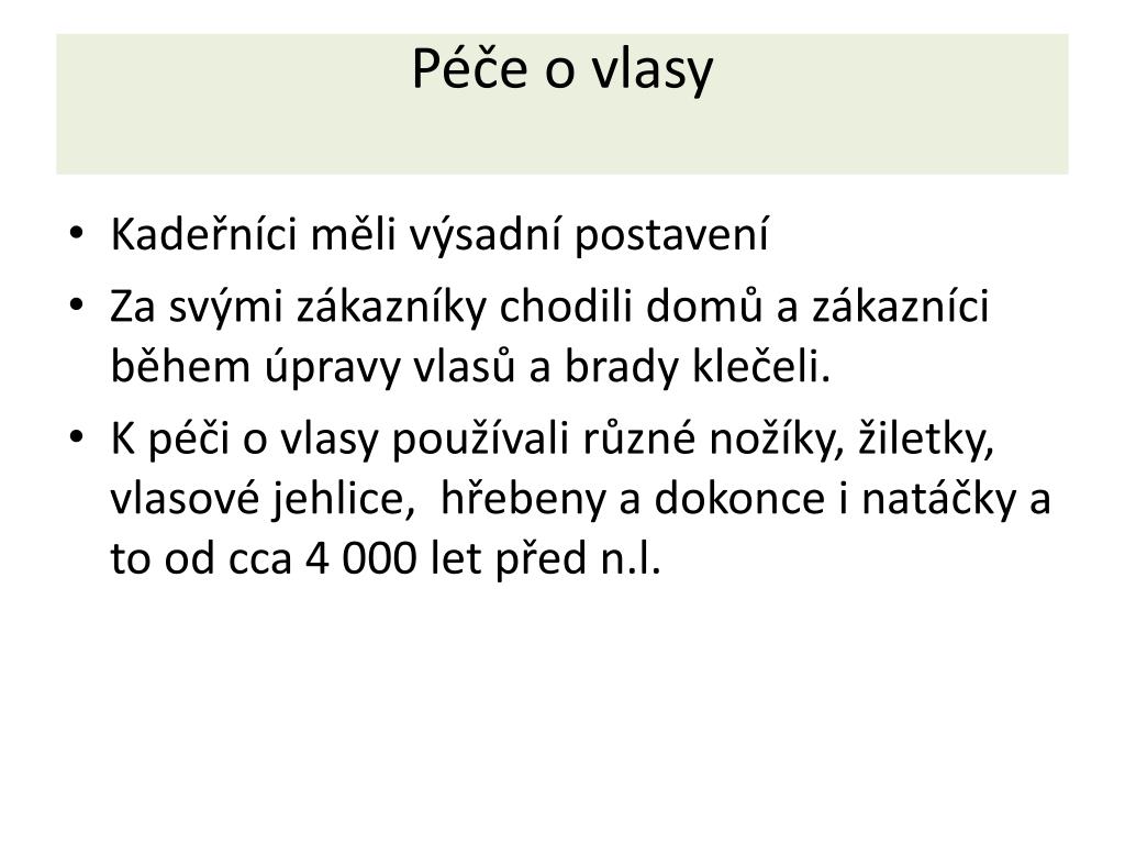 Péče o vlasy • Kadeřníci měli výsadní postavení • Za svými zákazníky chodili domů a zákazníci během úpravy vlasů a brady klečeli. • K péči o vlasy používali různé nožíky, žiletky, vlasové jehlice, hřebeny a dokonce i natáčky a to od cca 4 000 let před n.l.