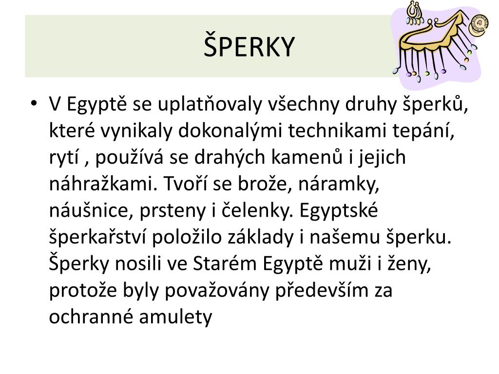 ŠPERKY • V Egyptě se uplatňovaly všechny druhy šperků, které vynikaly dokonalými technikami tepání, rytí , používá se drahých kamenů i jejich náhražkami. Tvoří se brože, náramky, náušnice, prsteny i čelenky. Egyptské šperkařství položilo základy i našemu šperku. Šperky nosili ve Starém Egyptě muži i ženy, protože byly považovány především za ochranné amulety
