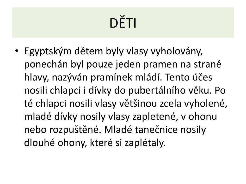 DĚTI • Egyptským dětem byly vlasy vyholovány, ponechán byl pouze jeden pramen na straně hlavy, nazýván pramínek mládí. Tento účes nosili chlapci i dívky do pubertálního věku. Po té chlapci nosili vlasy většinou zcela vyholené, mladé dívky nosily vlasy zapletené, v ohonu nebo rozpuštěné. Mladé tanečnice nosily dlouhé ohony, které si zaplétaly.