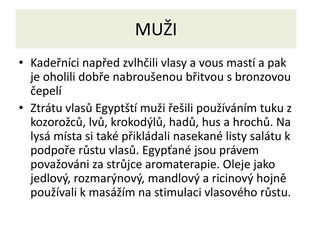 MUŽI • Kadeřníci napřed zvlhčili vlasy a vous mastí a pak je oholili dobře nabroušenou břitvou s bronzovou čepelí • Ztrátu vlasů Egyptští muži řešili používáním tuku z kozorožců, lvů, krokodýlů, hadů, hus a hrochů. Na lysá místa si také přikládali nasekané listy salátu k podpoře růstu vlasů. Egypťané jsou právem považováni za strůjce aromaterapie. Oleje jako jedlový, rozmarýnový, mandlový a ricinový hojně používali k masážím na stimulaci vlasového růstu.