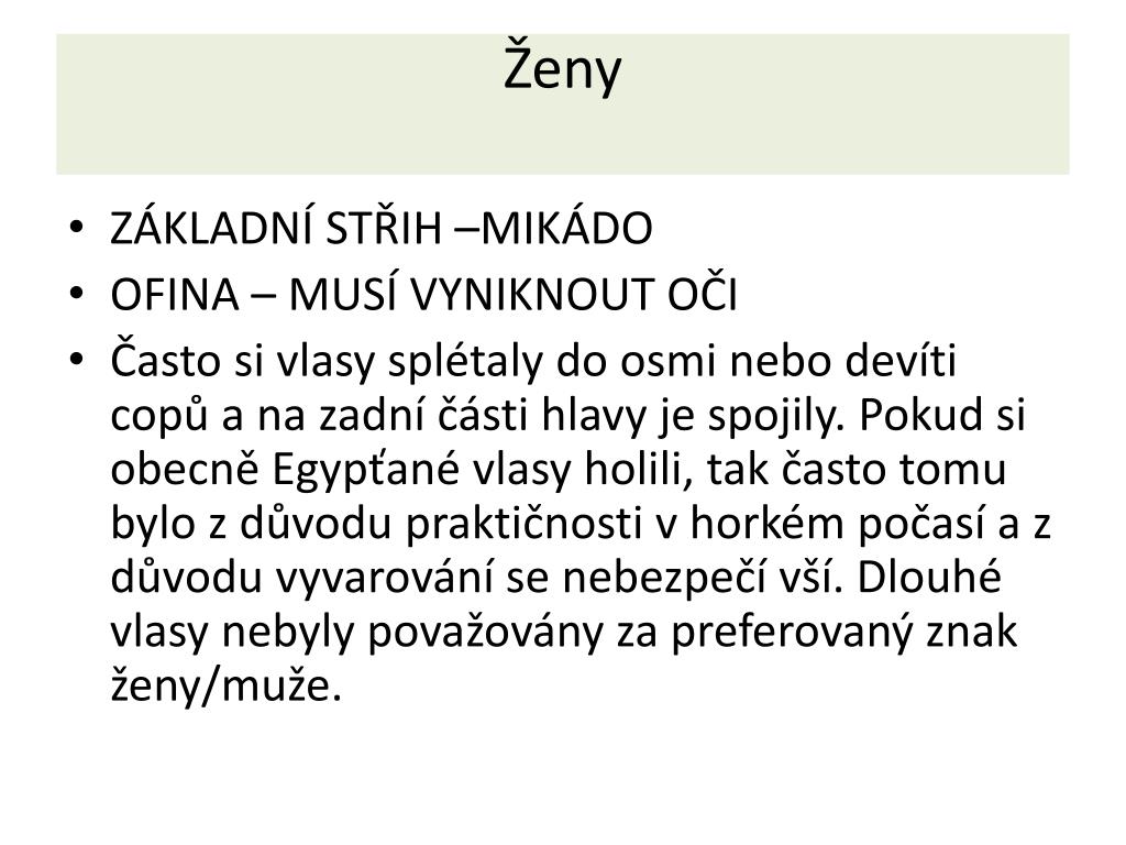 Ženy • ZÁKLADNÍ STŘIH –MIKÁDO • OFINA – MUSÍ VYNIKNOUT OČI • Často si vlasy splétaly do osmi nebo devíti copů a na zadní části hlavy je spojily. Pokud si obecně Egypťané vlasy holili, tak často tomu bylo z důvodu praktičnosti v horkém počasí a z důvodu vyvarování se nebezpečí vší. Dlouhé vlasy nebyly považovány za preferovaný znak ženy/muže.