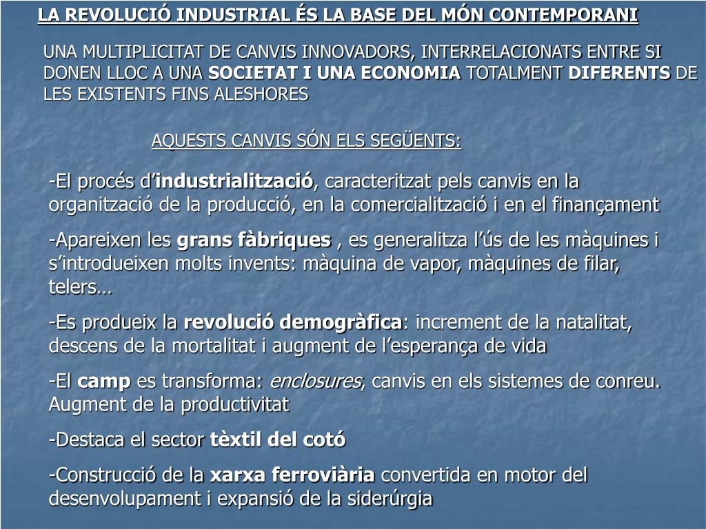LA REVOLUCIÓ INDUSTRIAL ÉS LA BASE DEL MÓN CONTEMPORANI UNA MULTIPLICITAT DE CANVIS INNOVADORS, INTERRELACIONATS ENTRE SI DONEN LLOC A UNA SOCIETAT I UNA ECONOMIA TOTALMENT DIFERENTS DE LES EXISTENTS FINS ALESHORES AQUESTS CANVIS SÓN ELS SEGÜENTS: • El procés d’industrialització, caracteritzat pels canvis en la organització de la producció, en la comercialització i en el finançament • Apareixen les grans fàbriques , es generalitza l’ús de les màquines i s’introdueixen molts invents: màquina de vapor, màquines de filar, telers… • Es produeix la revolució demogràfica: increment de la natalitat, descens de la mortalitat i augment de l’esperança de vida • El camp es transforma: enclosures, canvis en els sistemes de conreu. Augment de la productivitat • Destaca el sector tèxtil del cotó • Construcció de la xarxa ferroviària convertida en motor del desenvolupament i expansió de la siderúrgia