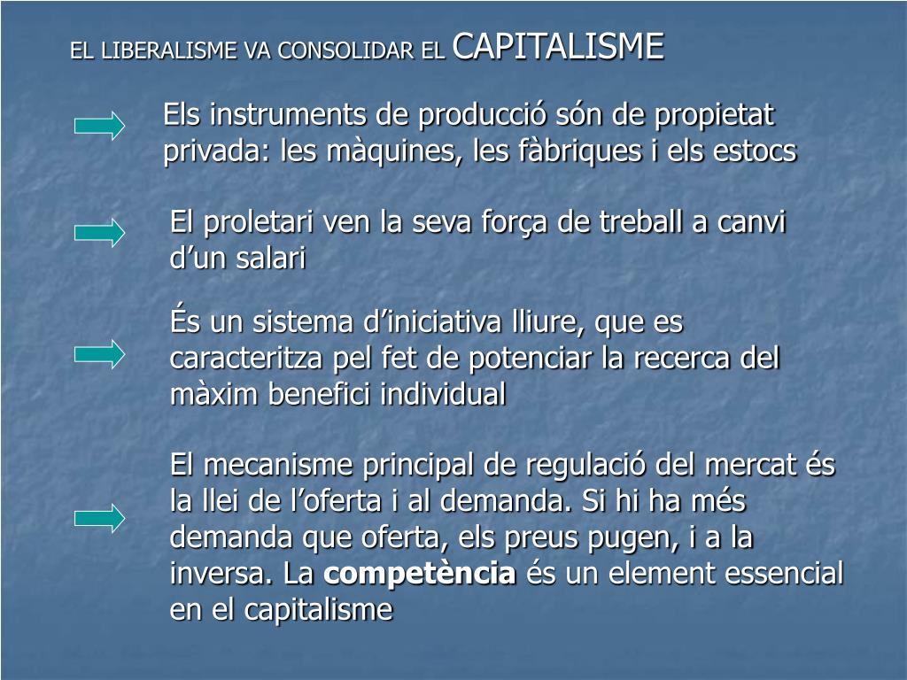 EL LIBERALISME VA CONSOLIDAR EL CAPITALISME Els instruments de producció són de propietat privada: les màquines, les fàbriques i els estocs El proletari ven la seva força de treball a canvi d’un salari És un sistema d’iniciativa lliure, que es caracteritza pel fet de potenciar la recerca del màxim benefici individual El mecanisme principal de regulació del mercat és la llei de l’oferta i al demanda. Si hi ha més demanda que oferta, els preus pugen, i a la inversa. La competència és un element essencial en el capitalisme