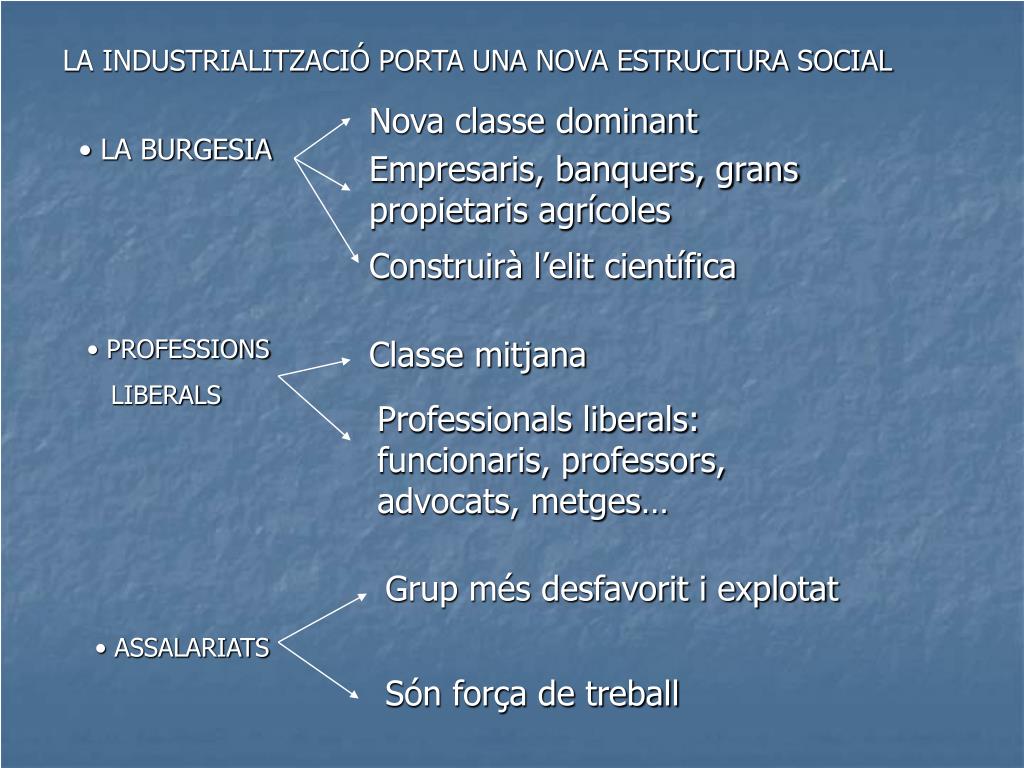 LA INDUSTRIALITZACIÓ PORTA UNA NOVA ESTRUCTURA SOCIAL Nova classe dominant • LA BURGESIA Empresaris, banquers, grans propietaris agrícoles Construirà l’elit científica • PROFESSIONS • LIBERALS Classe mitjana Professionals liberals: funcionaris, professors, advocats, metges… Grup més desfavorit i explotat • ASSALARIATS Són força de treball