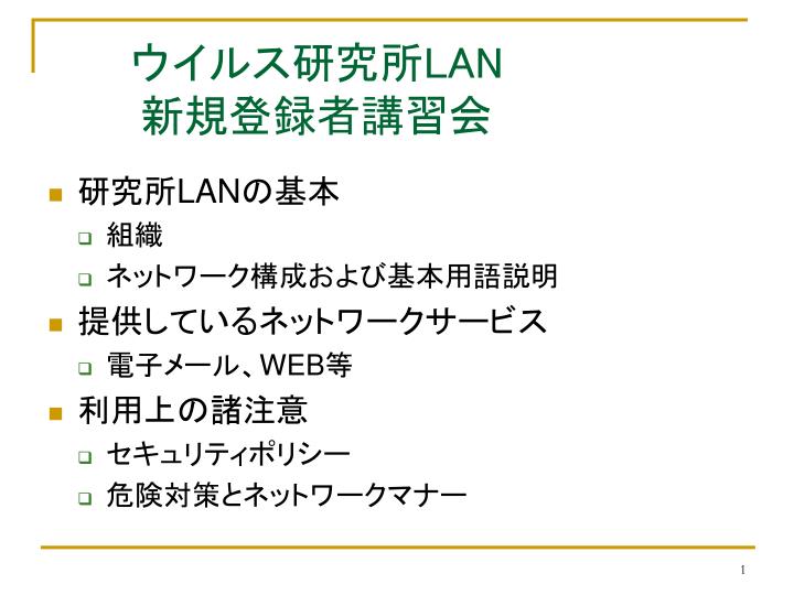 ウイルス研究所LAN新規登録者講習会 • 研究所LANの基本 • 組織 • ネットワーク構成および基本用語説明 • 提供しているネットワークサービス • 電子メール、WEB等 • 利用上の諸注意 • セキュリティポリシー • 危険対策とネットワークマナー