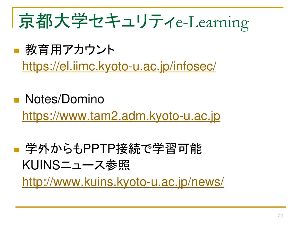 京都大学セキュリティe-Learning • 教育用アカウント https://el.iimc.kyoto-u.ac.jp/infosec/ • Notes/Domino https://www.tam2.adm.kyoto-u.ac.jp • 学外からもPPTP接続で学習可能 KUINSニュース参照 http://www.kuins.kyoto-u.ac.jp/news/