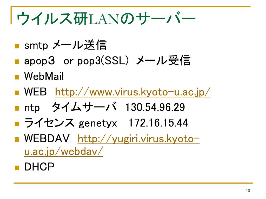 ウイルス研LANのサーバー • smtp メール送信 • apop3 or pop3(SSL) メール受信 • WebMail • WEBhttp://www.virus.kyoto-u.ac.jp/ • ntp タイムサーバ 130.54.96.29 • ライセンス genetyx 172.16.15.44 • WEBDAVhttp://yugiri.virus.kyoto-u.ac.jp/webdav/ • DHCP