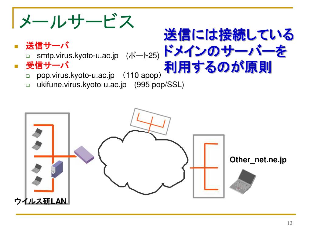 メールサービス 送信には接続しているドメインのサーバーを利用するのが原則 • 送信サーバ • smtp.virus.kyoto-u.ac.jp (ポート25) • 受信サーバ • pop.virus.kyoto-u.ac.jp (110 apop) • ukifune.virus.kyoto-u.ac.jp(995 pop/SSL) Other_net.ne.jp ウイルス研LAN