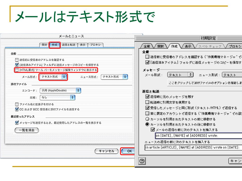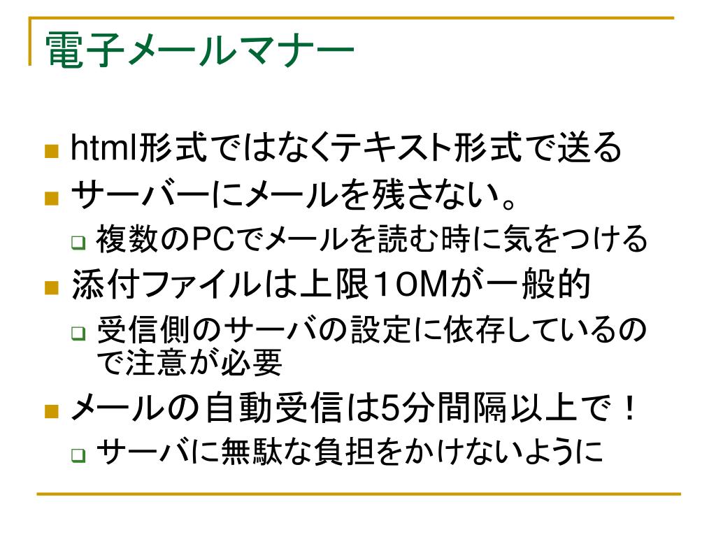 電子メールマナー • html形式ではなくテキスト形式で送る • サーバーにメールを残さない。 • 複数のPCでメールを読む時に気をつける • 添付ファイルは上限10Mが一般的 • 受信側のサーバの設定に依存しているので注意が必要 • メールの自動受信は5分間隔以上で! • サーバに無駄な負担をかけないように