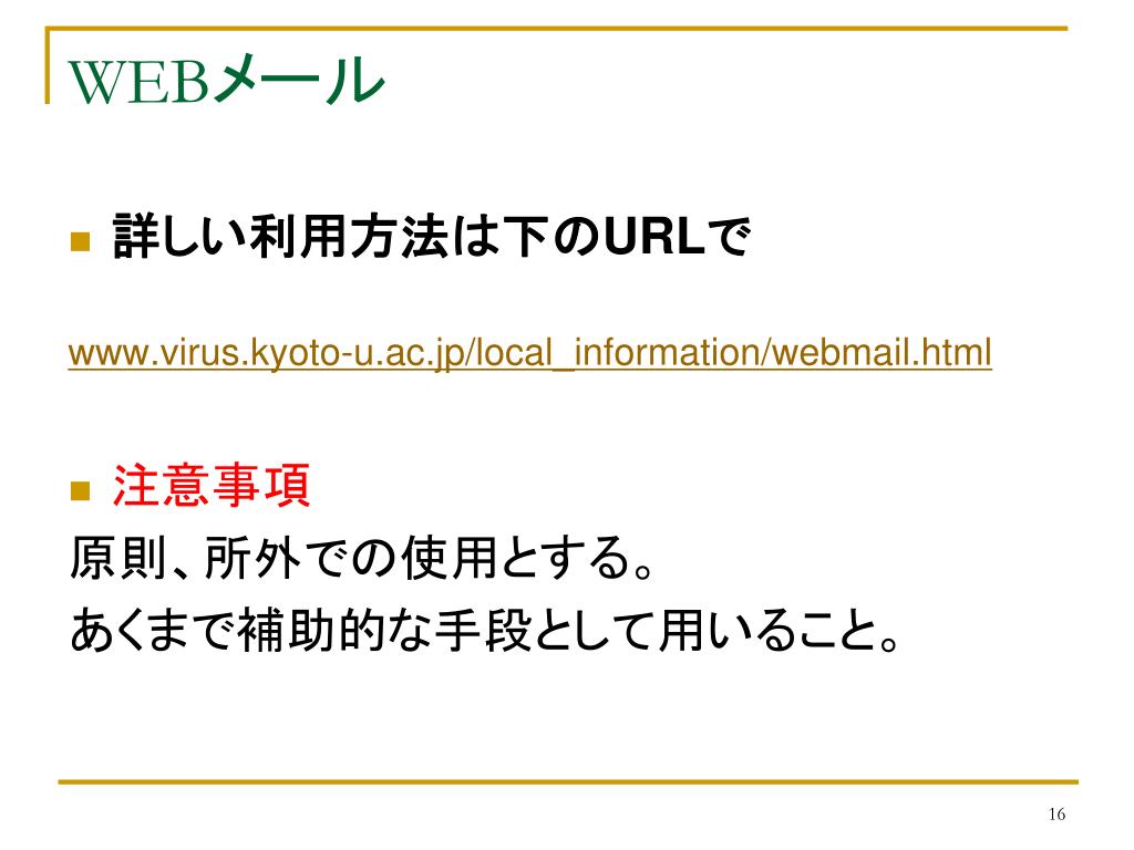 WEBメール • 詳しい利用方法は下のURLで www.virus.kyoto-u.ac.jp/local_information/webmail.html • 注意事項 原則、所外での使用とする。 あくまで補助的な手段として用いること。