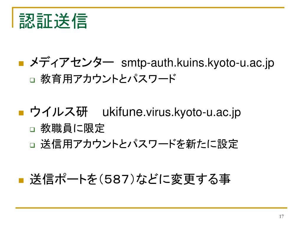 認証送信 • メディアセンターsmtp-auth.kuins.kyoto-u.ac.jp • 教育用アカウントとパスワード • ウイルス研 ukifune.virus.kyoto-u.ac.jp • 教職員に限定 • 送信用アカウントとパスワードを新たに設定 • 送信ポートを(587)などに変更する事