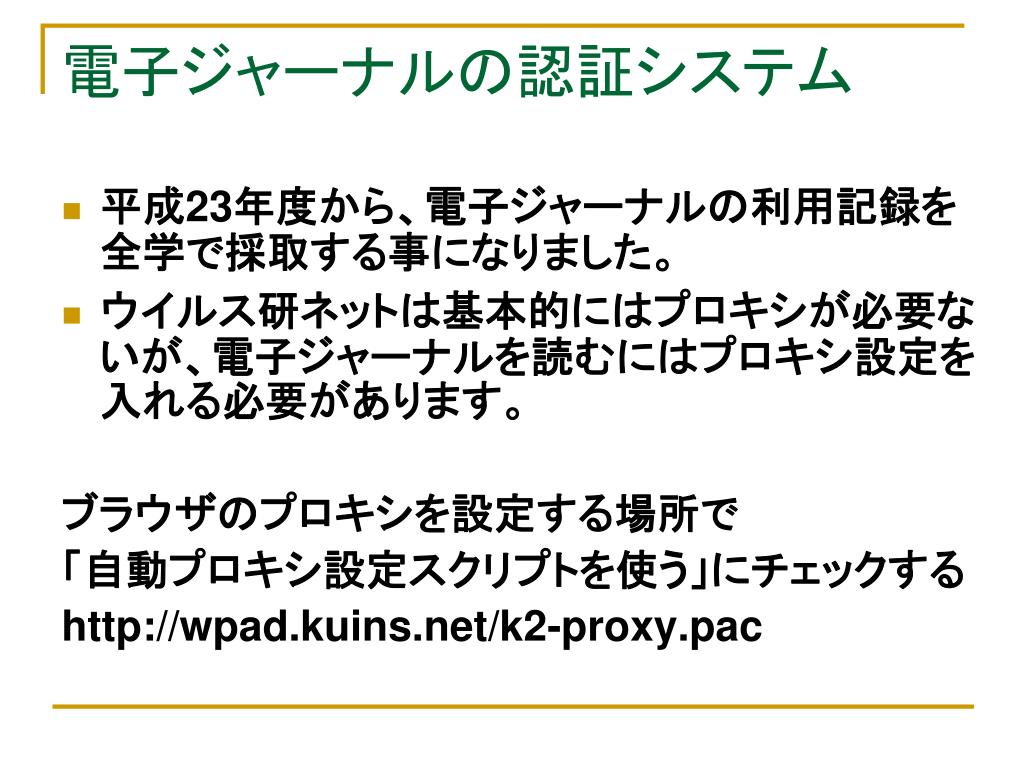 電子ジャーナルの認証システム • 平成23年度から、電子ジャーナルの利用記録を全学で採取する事になりました。 • ウイルス研ネットは基本的にはプロキシが必要ないが、電子ジャーナルを読むにはプロキシ設定を入れる必要があります。 ブラウザのプロキシを設定する場所で 「自動プロキシ設定スクリプトを使う」にチェックする http://wpad.kuins.net/k2-proxy.pac