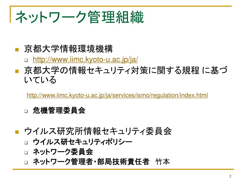 ウイルス研究所 LAN 新規登録者講習会. 研究所 LAN の基本 組織 ネットワーク構成および基本用語説明 提供しているネットワークサービス 電子メール、 WEB 等 利用上の諸注意 セキュリティポリシー 危険対策とネットワークマナー. ネットワーク管理組織. 京都大学情報環境機構 http://www.iimc.kyoto-u.ac.jp/ja/ 京都大学の情報セキュリティ対策に関する規程 に基づいている 危機管理委員会 ウイルス研究所情報セキュリティ委員会 ウイルス研セキュリティポリシー ネットワーク委員会 ネットワーク管理者・部局技術責任者 竹本.