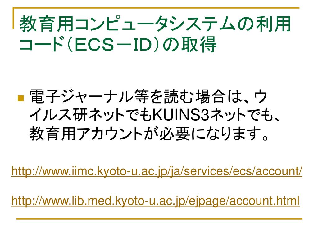 教育用コンピュータシステムの利用コード(ECS-ID)の取得教育用コンピュータシステムの利用コード(ECS-ID)の取得 • 電子ジャーナル等を読む場合は、ウイルス研ネットでもKUINS3ネットでも、教育用アカウントが必要になります。 http://www.iimc.kyoto-u.ac.jp/ja/services/ecs/account/ http://www.lib.med.kyoto-u.ac.jp/ejpage/account.html
