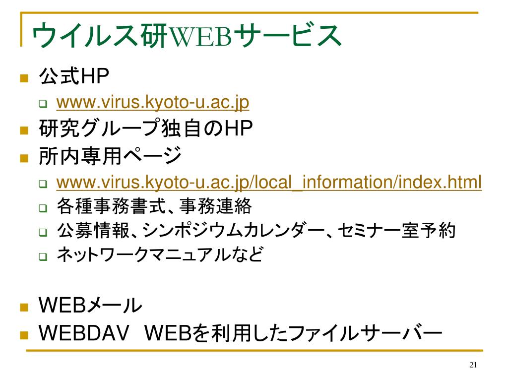 ウイルス研WEBサービス • 公式HP • www.virus.kyoto-u.ac.jp • 研究グループ独自のHP • 所内専用ページ • www.virus.kyoto-u.ac.jp/local_information/index.html • 各種事務書式、事務連絡 • 公募情報、シンポジウムカレンダー、セミナー室予約 • ネットワークマニュアルなど • WEBメール • WEBDAVWEBを利用したファイルサーバー