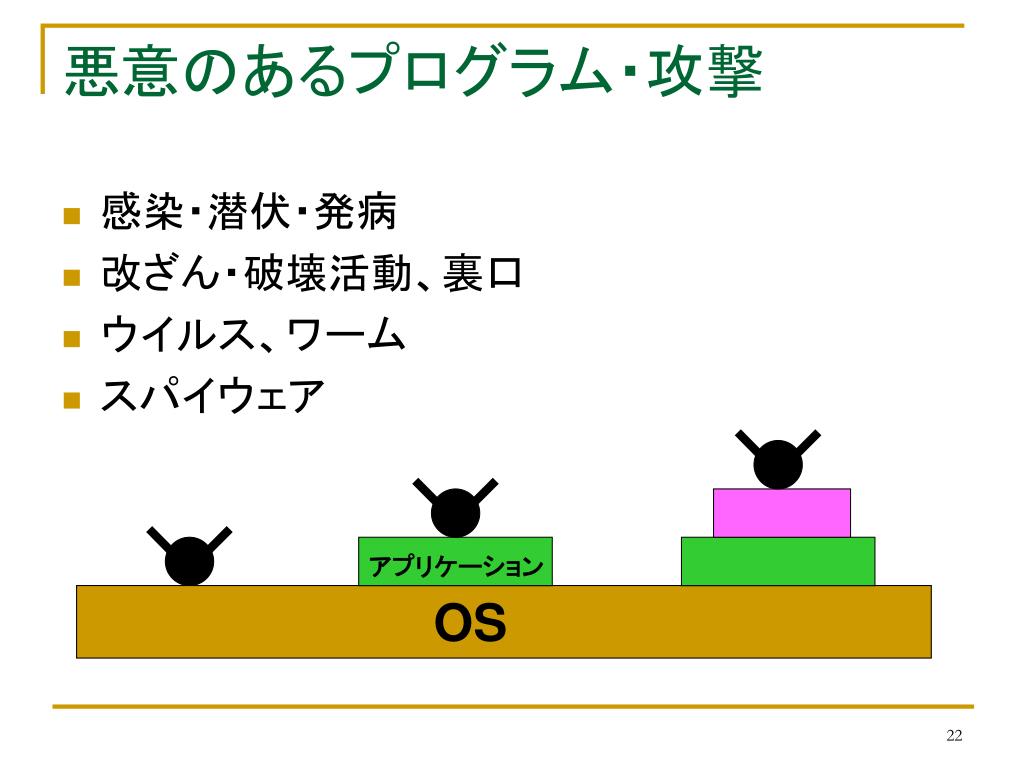 悪意のあるプログラム・攻撃 • 感染・潜伏・発病 • 改ざん・破壊活動、裏口 • ウイルス、ワーム • スパイウェア アプリケーション OS