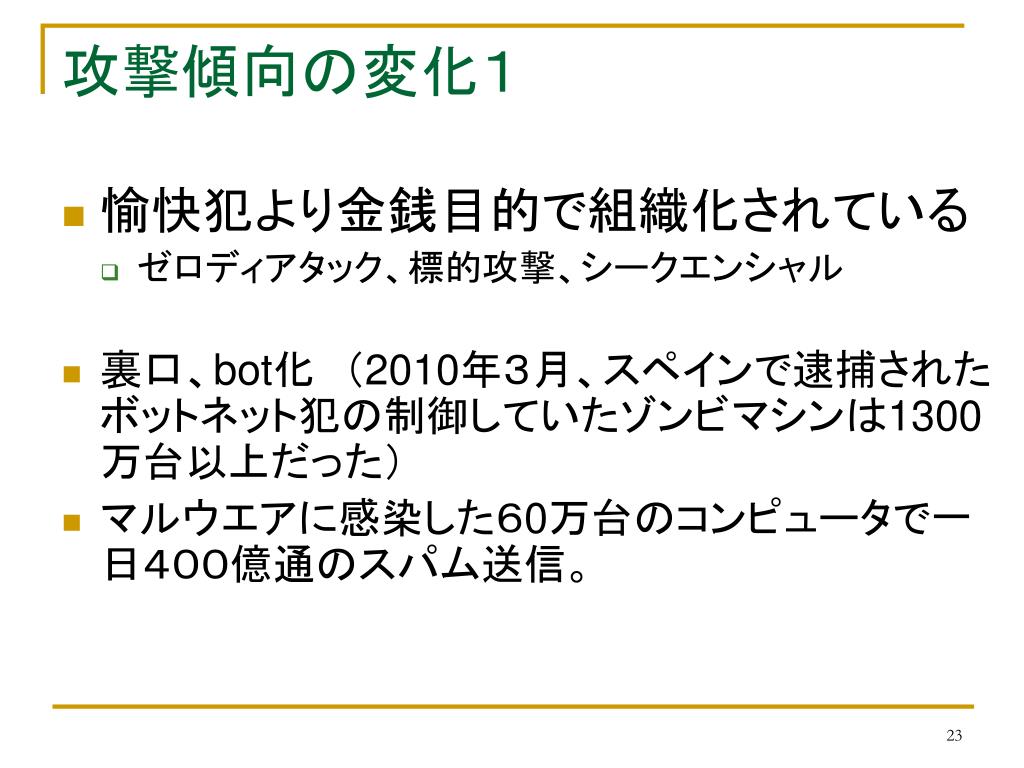 攻撃傾向の変化1 • 愉快犯より金銭目的で組織化されている • ゼロディアタック、標的攻撃、シークエンシャル • 裏口、bot化 (2010年3月、スペインで逮捕されたボットネット犯の制御していたゾンビマシンは1300万台以上だった) • マルウエアに感染した60万台のコンピュータで一日400億通のスパム送信。
