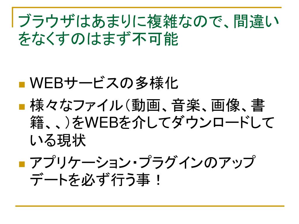ブラウザはあまりに複雑なので、間違いをなくすのはまず不可能ブラウザはあまりに複雑なので、間違いをなくすのはまず不可能 • WEBサービスの多様化 • 様々なファイル(動画、音楽、画像、書籍、、)をWEBを介してダウンロードしている現状 • アプリケーション・プラグインのアップデートを必ず行う事!