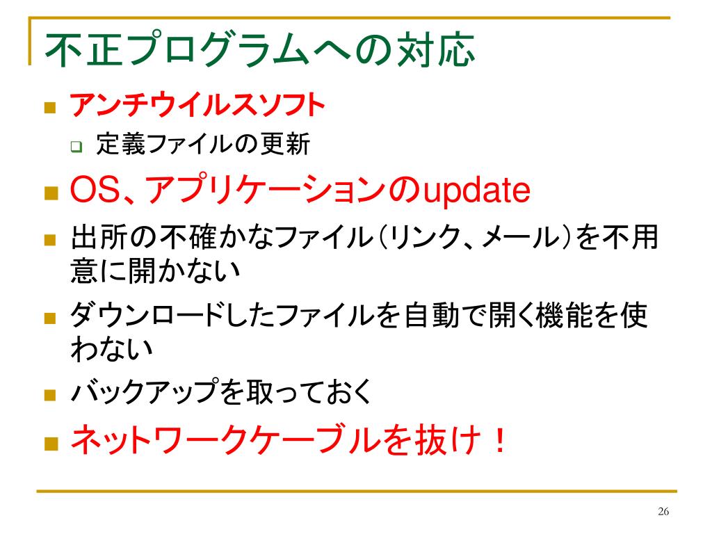 不正プログラムへの対応 • アンチウイルスソフト • 定義ファイルの更新 • OS、アプリケーションのupdate • 出所の不確かなファイル(リンク、メール)を不用意に開かない • ダウンロードしたファイルを自動で開く機能を使わない • バックアップを取っておく • ネットワークケーブルを抜け!