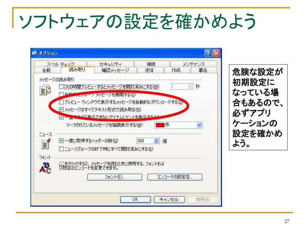 ソフトウェアの設定を確かめよう 危険な設定が初期設定になっている場合もあるので、必ずアプリケーションの設定を確かめよう。