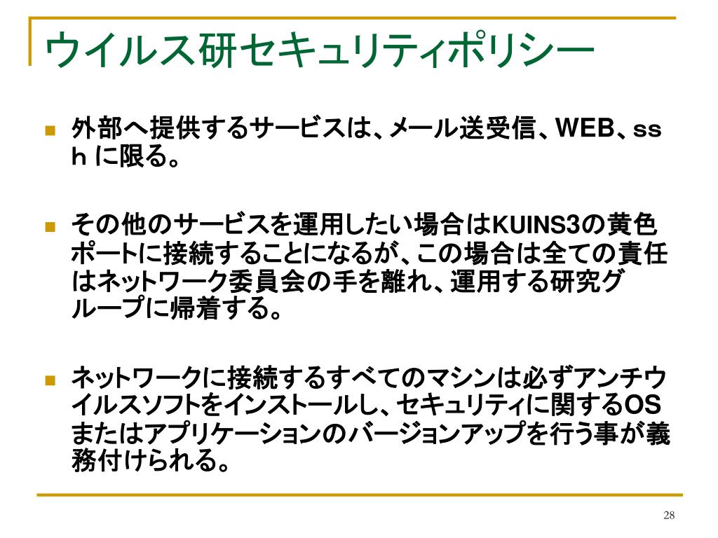 ウイルス研セキュリティポリシー • 外部へ提供するサービスは、メール送受信、WEB、sshに限る。 • その他のサービスを運用したい場合はKUINS3の黄色ポートに接続することになるが、この場合は全ての責任はネットワーク委員会の手を離れ、運用する研究グループに帰着する。 • ネットワークに接続するすべてのマシンは必ずアンチウイルスソフトをインストールし、セキュリティに関するOSまたはアプリケーションのバージョンアップを行う事が義務付けられる。