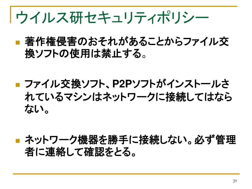 ウイルス研セキュリティポリシー • 著作権侵害のおそれがあることからファイル交換ソフトの使用は禁止する。 • ファイル交換ソフト、P2Pソフトがインストールされているマシンはネットワークに接続してはならない。 • ネットワーク機器を勝手に接続しない。必ず管理者に連絡して確認をとる。