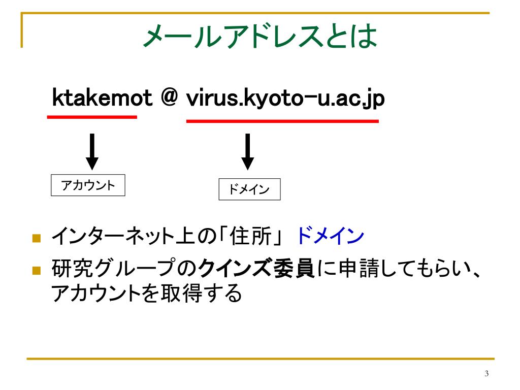 メールアドレスとは ktakemot @ virus.kyoto-u.ac.jp • インターネット上の「住所」 ドメイン • 研究グループのクインズ委員に申請してもらい、アカウントを取得する アカウント ドメイン