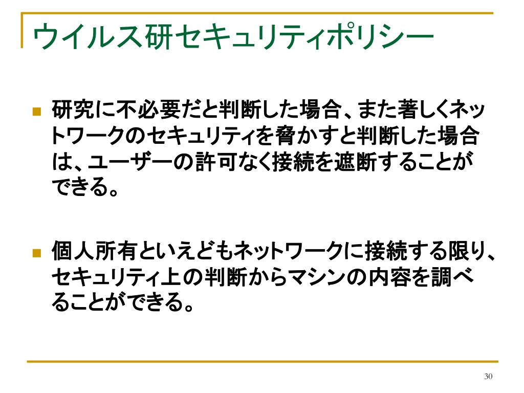 ウイルス研セキュリティポリシー • 研究に不必要だと判断した場合、また著しくネットワークのセキュリティを脅かすと判断した場合は、ユーザーの許可なく接続を遮断することができる。 • 個人所有といえどもネットワークに接続する限り、セキュリティ上の判断からマシンの内容を調べることができる。