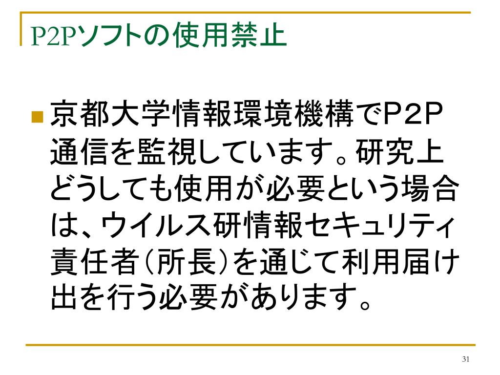 P2Pソフトの使用禁止 • 京都大学情報環境機構でP2P通信を監視しています。研究上どうしても使用が必要という場合は、ウイルス研情報セキュリティ責任者(所長)を通じて利用届け出を行う必要があります。