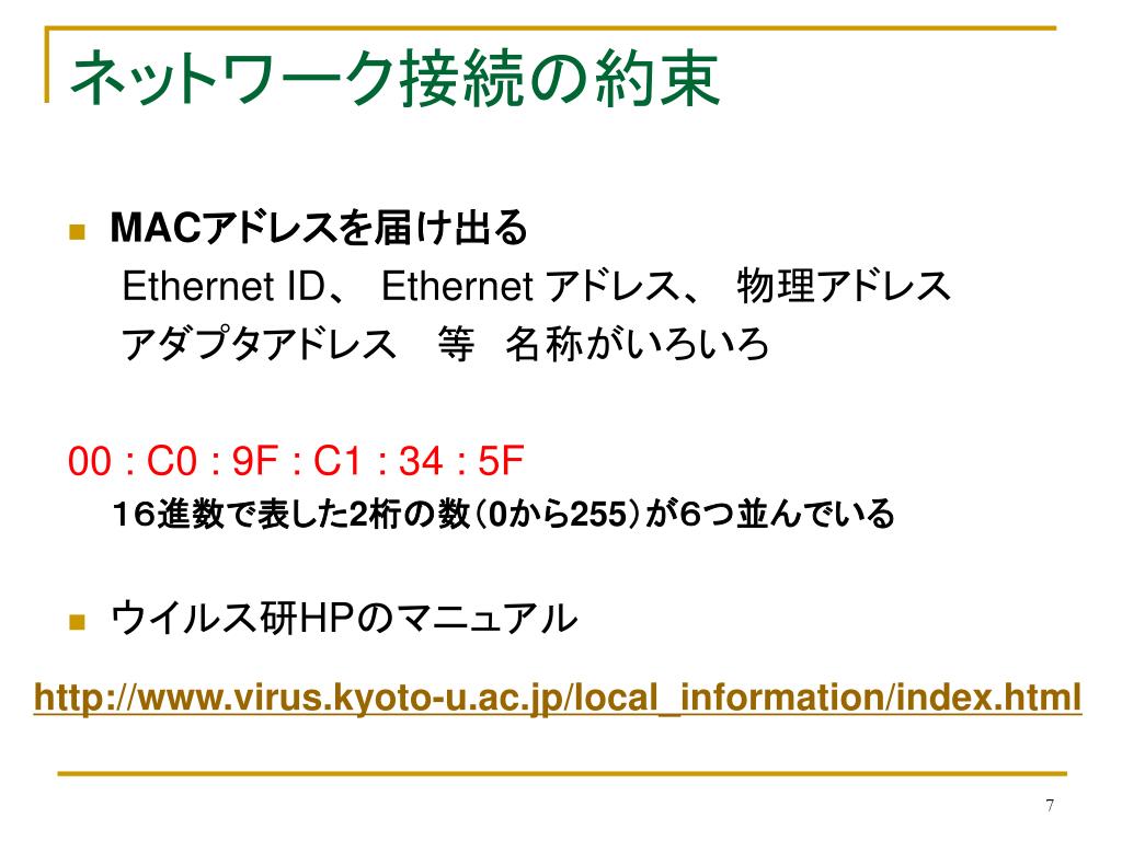 ネットワーク接続の約束 • MACアドレスを届け出る Ethernet ID、 Ethernet アドレス、 物理アドレス アダプタアドレス 等 名称がいろいろ 00 : C0 : 9F : C1 : 34 : 5F 16進数で表した2桁の数(0から255)が6つ並んでいる • ウイルス研HPのマニュアル http://www.virus.kyoto-u.ac.jp/local_information/index.html