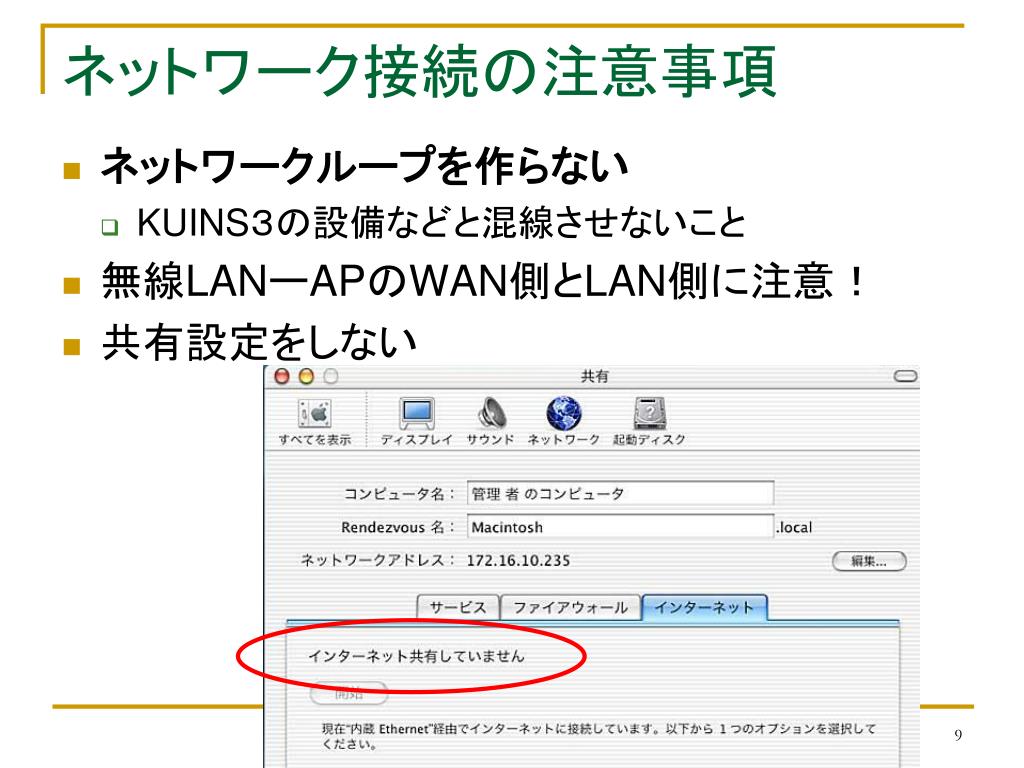 ネットワーク接続の注意事項 • ネットワークループを作らない • KUINS3の設備などと混線させないこと • 無線LANーAPのWAN側とLAN側に注意! • 共有設定をしない