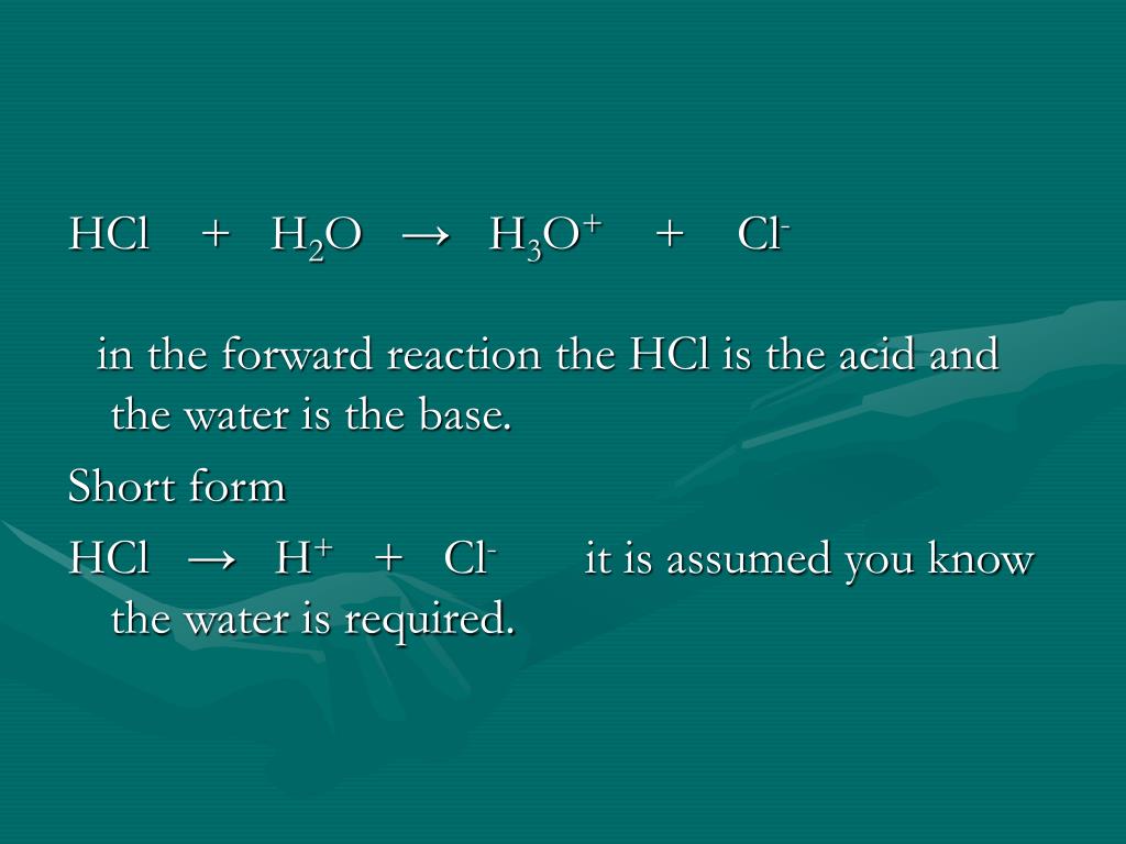 HCl + H2O → H3O+ + Cl- in the forward reaction the HCl is the acid and the water is the base. Short form HCl → H+ + Cl- it is assumed you know the water is required.