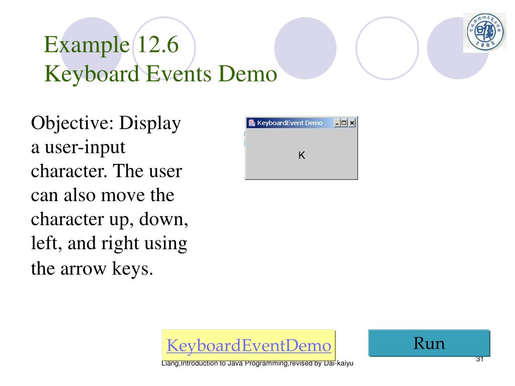 Example 12.6Keyboard Events Demo Objective: Display a user-input character. The user can also move the character up, down, left, and right using the arrow keys. KeyboardEventDemo Run Liang,Introduction to Java Programming,revised by Dai-kaiyu