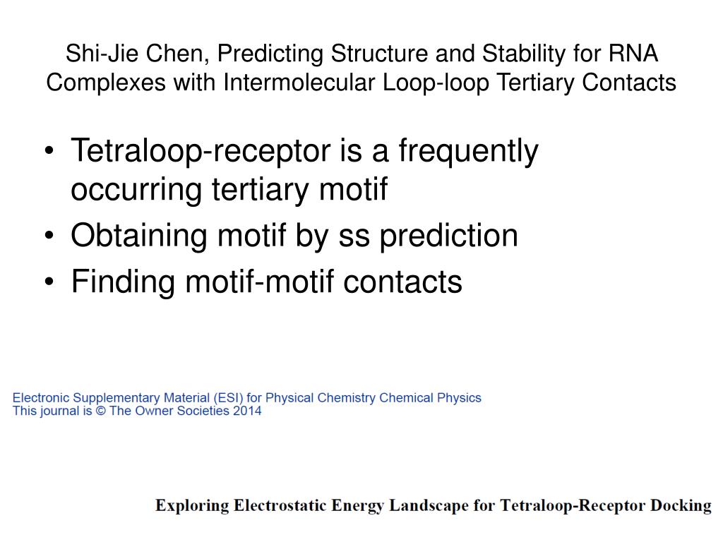 Shi-Jie Chen, Predicting Structure and Stability for RNA Complexes with Intermolecular Loop-loop Tertiary Contacts • Tetraloop-receptor is a frequently occurring tertiary motif • Obtaining motif by ss prediction • Finding motif-motif contacts
