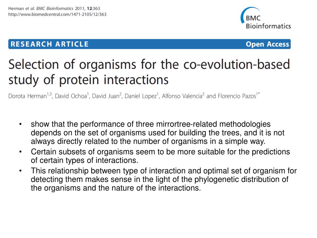 show that the performance of three mirrortree-related methodologies depends on the set of organisms used for building the trees, and it is not always directly related to the number of organisms in a simple way. • Certain subsets of organisms seem to be more suitable for the predictions of certain types of interactions. • This relationship between type of interaction and optimal set of organism for detecting them makes sense in the light of the phylogenetic distribution of the organisms and the nature of the interactions.