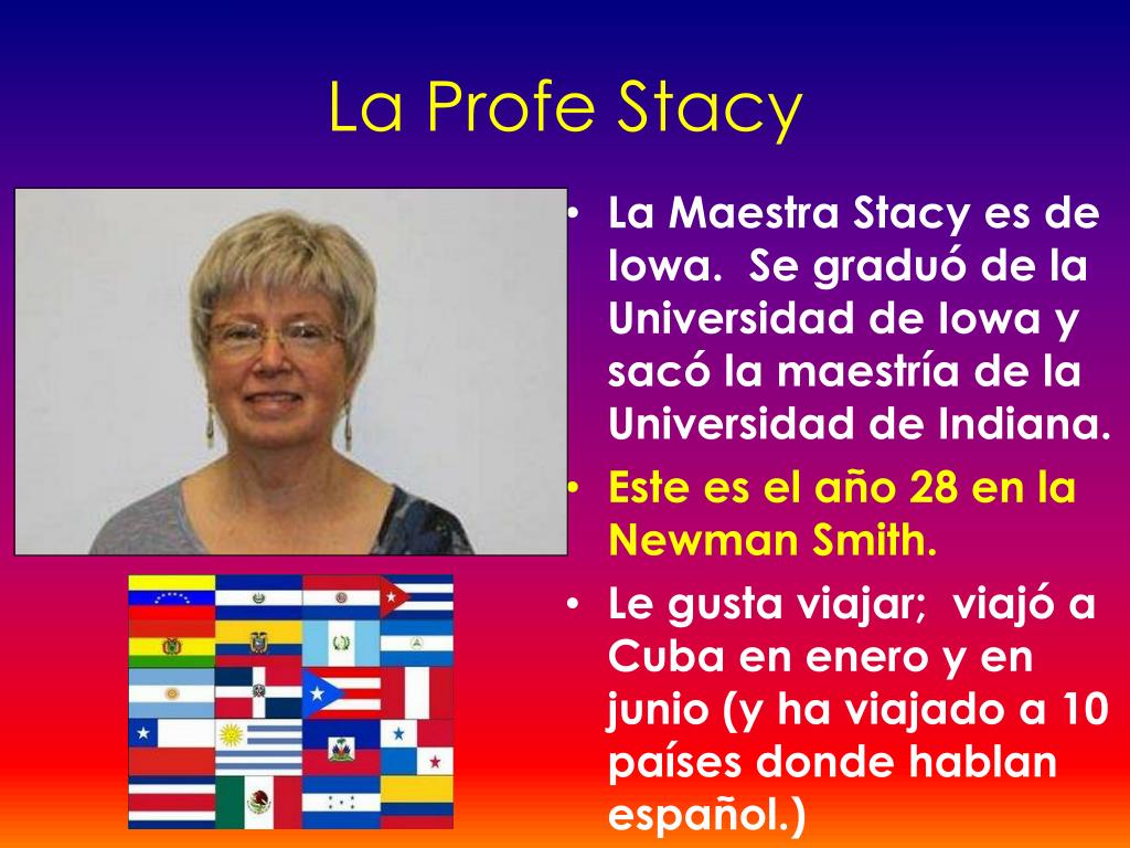 La Profe Stacy • La Maestra Stacy es de Iowa. Se graduó de la Universidad de Iowa y sacó la maestría de la Universidad de Indiana. • Este es el año 28 en la Newman Smith. • Le gustaviajar; viajó a Cuba en enero y en junio(y ha viajado a 10 paísesdondehablanespañol.)