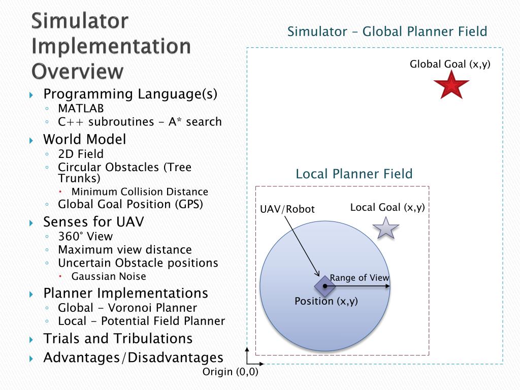 Simulator ImplementationOverview Simulator – Global Planner Field • Programming Language(s) • MATLAB • C++ subroutines - A* search • World Model • 2D Field • Circular Obstacles (Tree Trunks) • Minimum Collision Distance • Global Goal Position (GPS) • Senses for UAV • 360° View • Maximum view distance • Uncertain Obstacle positions • Gaussian Noise • Planner Implementations • Global - Voronoi Planner • Local - Potential Field Planner • Trials and Tribulations • Advantages/Disadvantages Global Goal (x,y) Local Goal (x,y) UAV/Robot Local Planner Field Range of View Position (x,y) Origin (0,0)